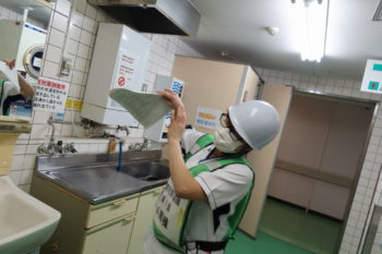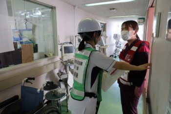 病棟内の破損状況を確認。給湯器が壊れてお湯が噴き出てて危険!
